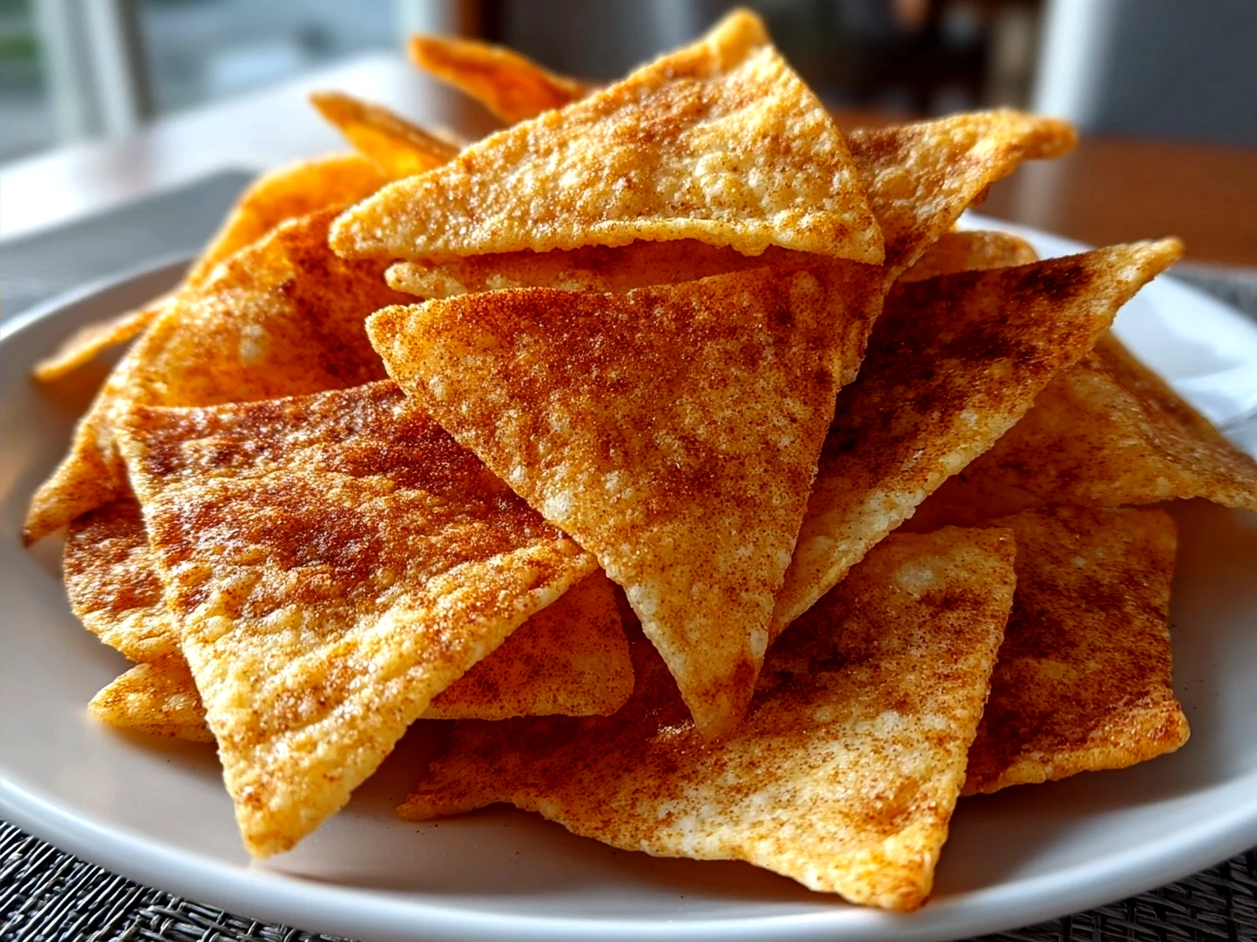 Crispy, sweet cinnamon tortilla chips make a delightful snack or dessert accompaniment that’s quick and easy to prepare.