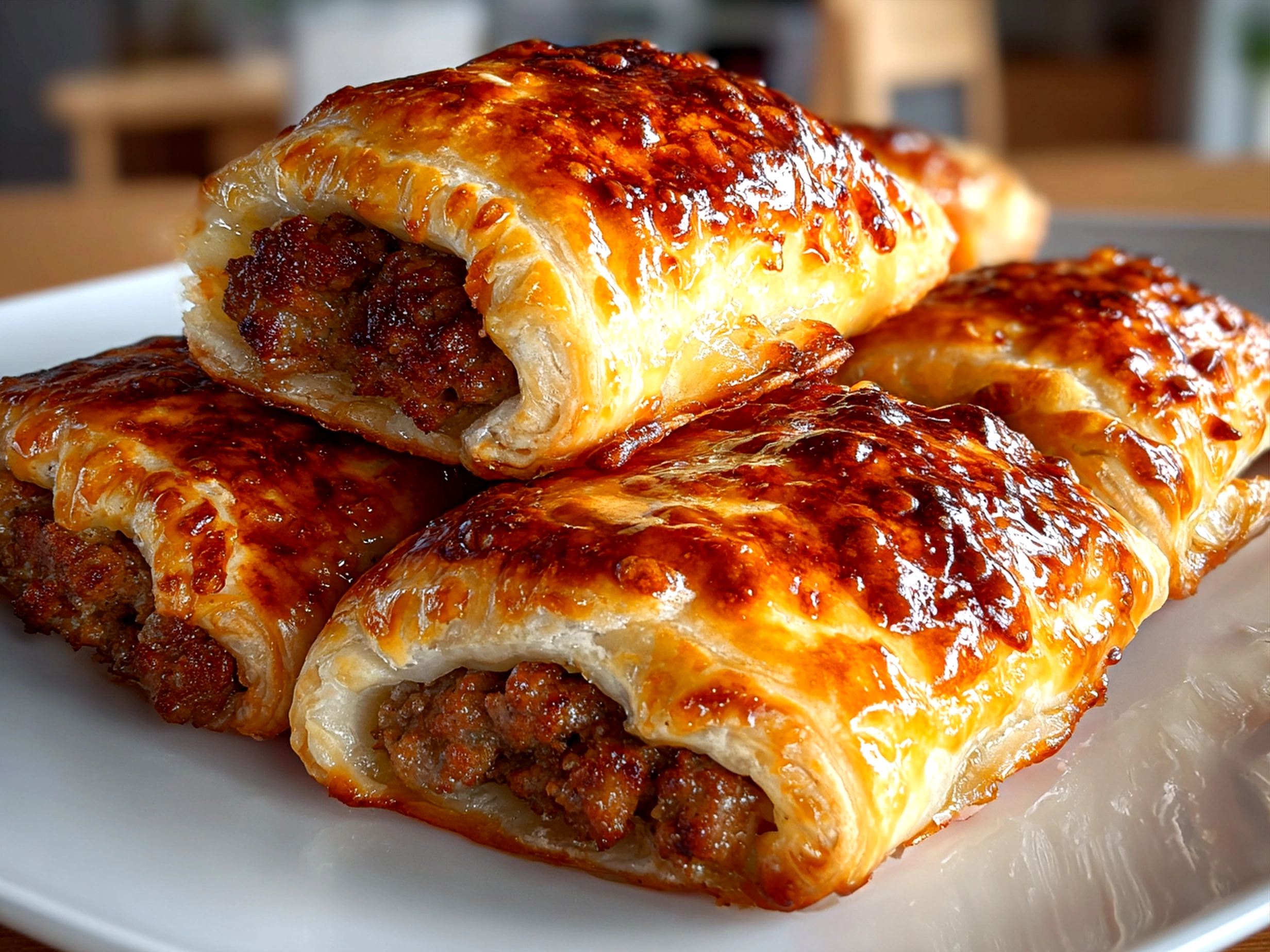 Classic sausage rolls featuring flaky puff pastry wrapped around savory seasoned sausage meat, perfect as a snack or party appetizer.
